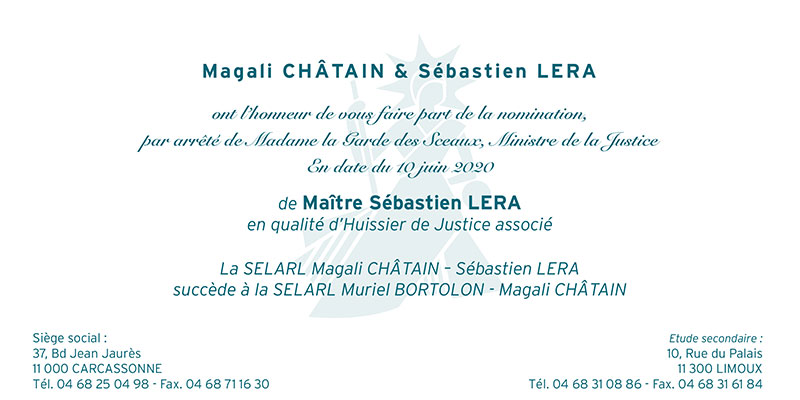 L’arrêté du 10 juin 2020 a rendu public la nomination de Maître Magali Châtain et de Maître Sebastien Lera, huissiers de justice associés. La dénomination sociale de la société d’exercice libéral à responsabilité limitée « Muriel Bortolon, Magali Châtain » est ainsi modifiée : « Magali Châtain Sébastien LERA suite au retrait de maître Bortolon.
